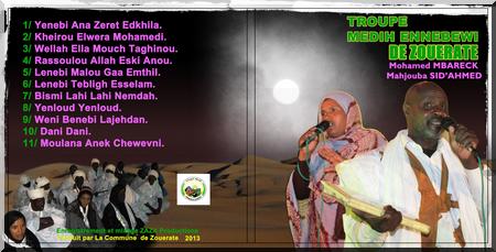 La sortie du premier CD de la Troupe du Medih Ennebewi de Zouerate est prévue pour le moi prochain. Le CD est composé de 11 titres des chants de Mohamed Ould Mbareck et Mahjouba Sid’Ahmed les deux voix d’or de la troupe.