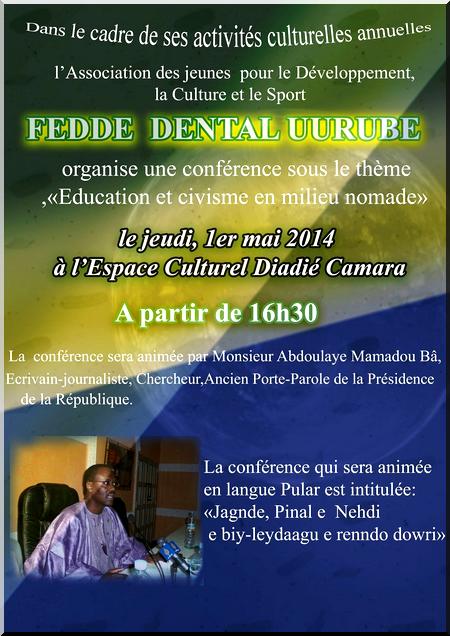 Fedde Dental Uurube - Dans le cadre de ses activités culturelles annuelles, l’Association des jeunes pour le Développement, la Culture et le sport dénommée Fedde Dental Uurube, organise une conférence sous le thème «Education et civisme en milieu nomade», le jeudi, 1er mai 2014, à l’Espace Culturel Diadié Camara (sis Socogim PS prés du collège des jeunes filles), à partir de 16h30.