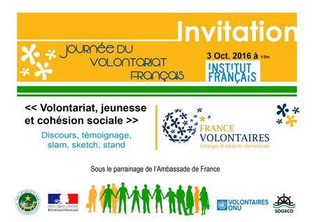 France volontaires et ses partenaires du Programme des Volontaires des Nations Unies, du Programme de Volontariat de Mauritanie, célébreront la Journée du Volontariat Français (JVF) par une cérémonie officielle le 3 octobre prochain à l’Institut Français de Mauritanie (IFM) à partir de 15h.