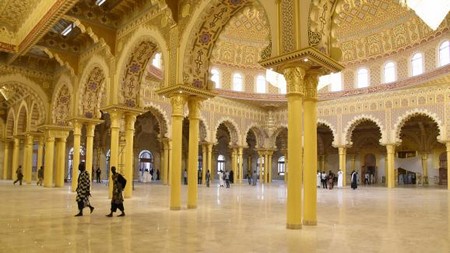 L’édifice religieux recouvert de marbre est doté de cinq minarets, dont le plus haut culmine à 78 mètres, et de salles de prière pouvant accueillir 15 000 personnes, autant que son esplanade. Elle est ornée de lustres monumentaux et de décorations faites par des artisans marocains. Avec une capacité totale de 30 000 places, la mosquée est toutefois moins grande que la mosquée Hassan II de Casablanca, au Maroc, d'une capacité totale de 105 000 personnes, ou que celle en cours d'achèvement à Alger (120 000 fidèles).