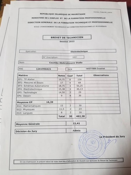 Elle s’appelle Coumba Abderrahmane Diallo, étudiante au centre technique de formation de Zouérate. Elle est titulaire d’un diplôme de Brevet de Technicien (BT) obtenu cette année 2022.