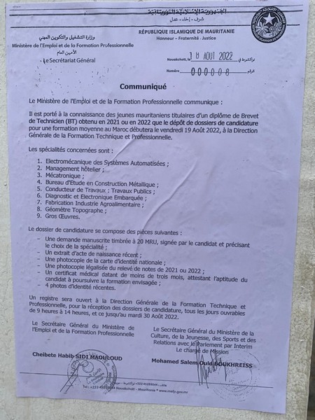 Le 18 août dernier, le ministère de l’Emploi et de la Formation Professionnelle porte à la connaissance des jeunes mauritaniens titulaires d’un diplôme de Brevet de Technicien (BT) obtenu en 2021 ou en 2022 que le dépôt de dossiers de candidature pour une formation moyenne au Maroc débutera le 19 aout 2022, à la Direction générale de la Formation Technique et Professionnelle.