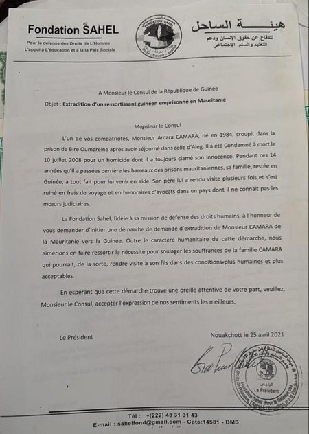 Une ONG de défense des droits de l’homme, avait adressé une lettre (à retrouver ci-dessous) au Consul de la Guinée en Mauritanie, demandant l’extradition de Amara Camara. Sur sa note, la Fondation Sahel pour la défense des droits humains, dit souhaiter soulager la souffrance de la famille de Amara Camara.